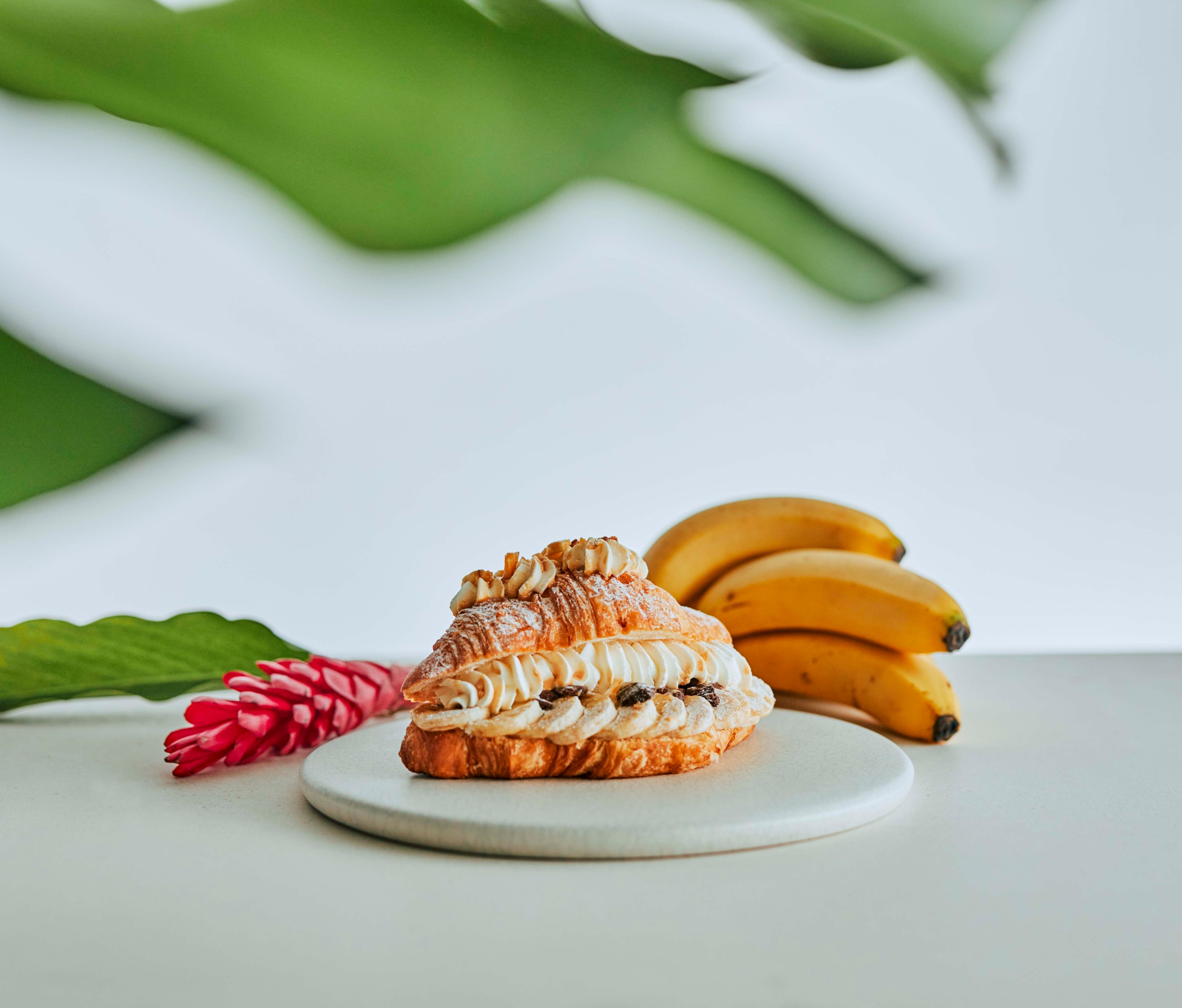 BANKの看板品であるクロワッサンの限定フレーバーです。国産の発酵バターで焼き上げたサクサクのクロワッサンの中に、フレッシュバナナのカスタードクリームとスライスバナナ、たっぷりのパリパリ食感のチョコレートをサンドしました。