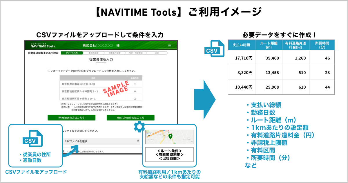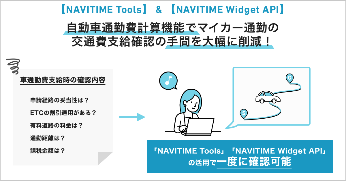 株式会社ナビタイムジャパン(代表取締役社長:大西啓介、本社:東京都港区)は、2022年6月29日(水)より、サイト上でCSVファイルをアップロードするだけで使える業務支援Webサービス『NAVITIME Tools』と、法人向け地図・ルート検索のWeb画面付きAPI『NAVITIME Widget API』にて、自動車での通勤費算出機能を提供開始いたします。