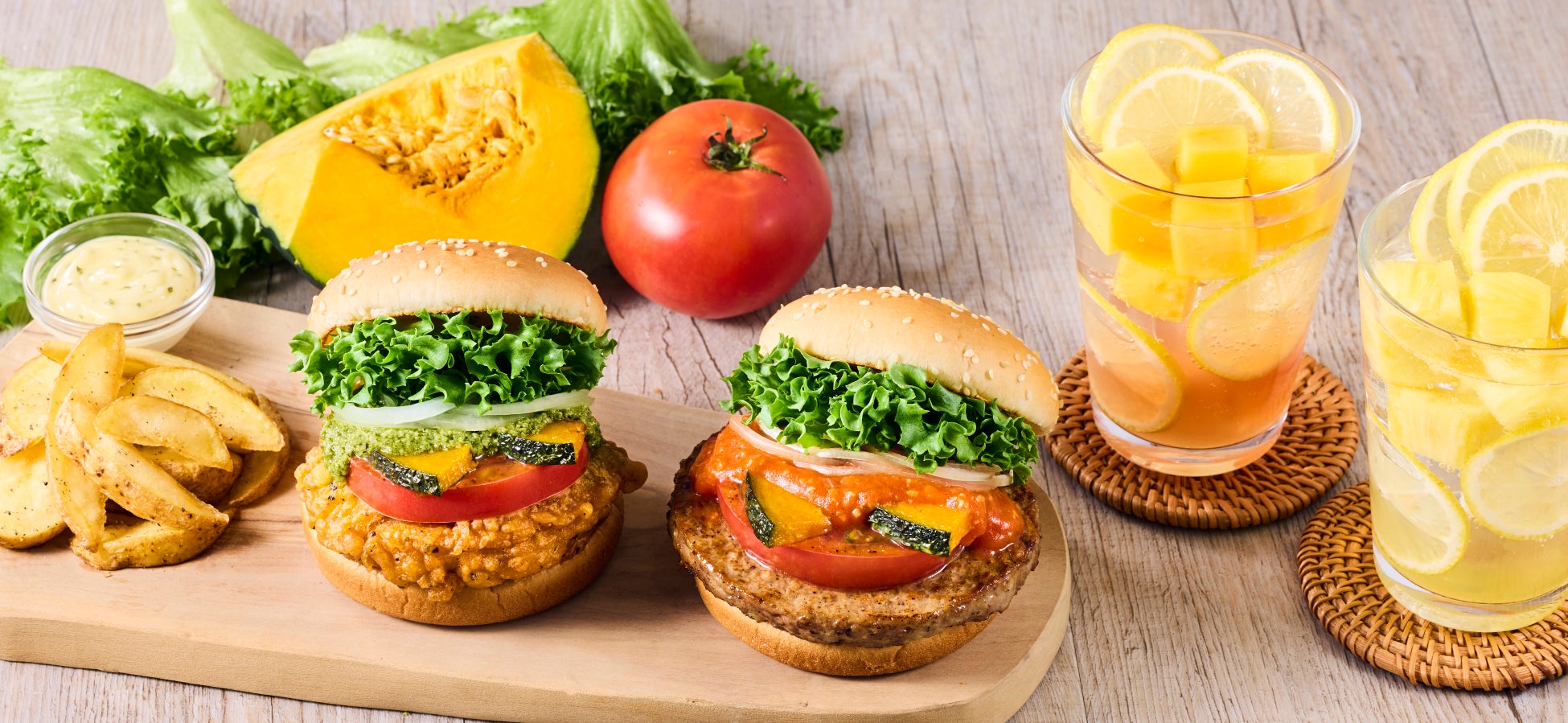 ジューシーなお肉と国産夏野菜を味わうバーガー夏バテ知らず!【サマーリフレッシュフェア】ひんやりゴロッと果実氷のレモネードも登場!