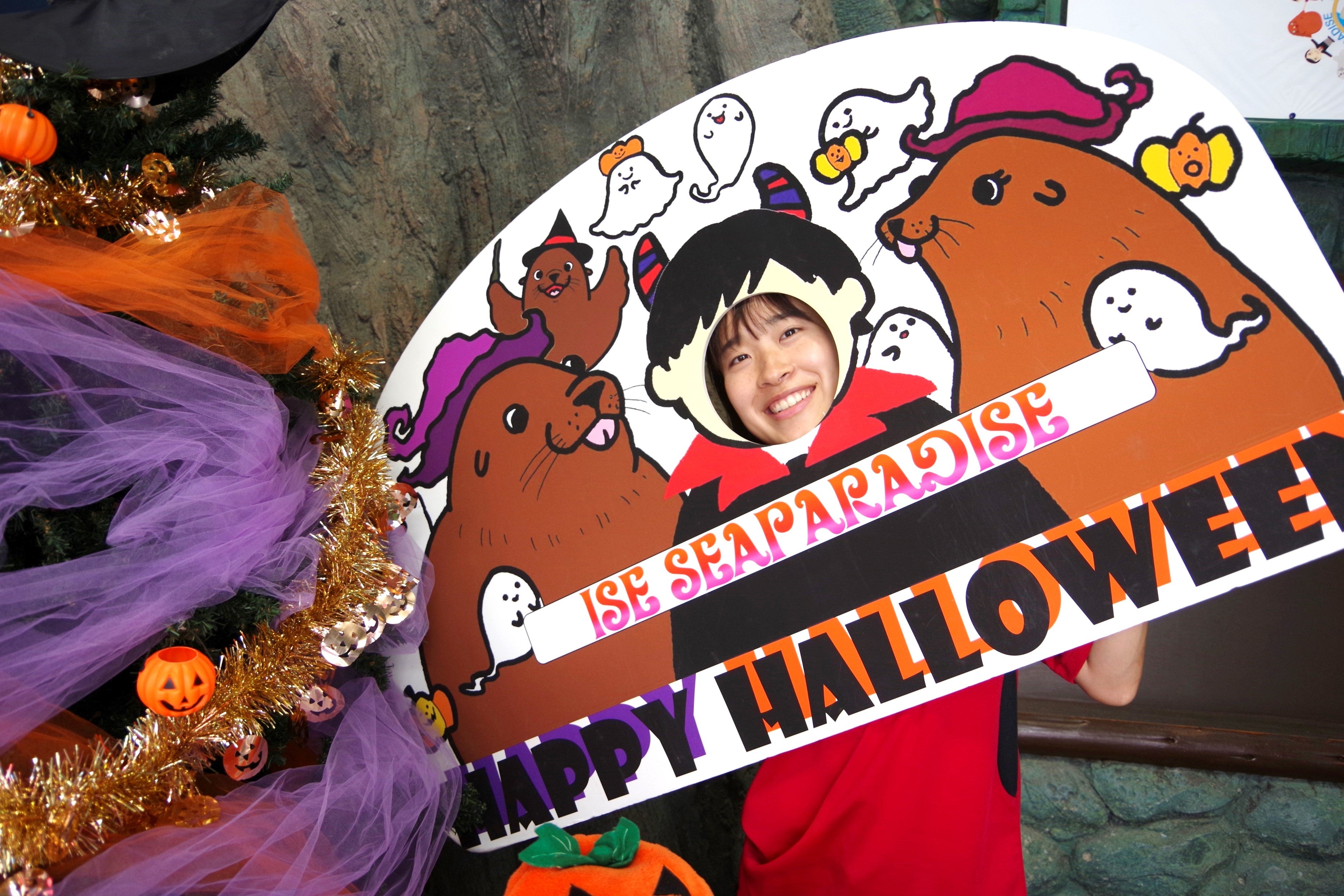 伊勢シーでのハロウィン仕様のツリーに、トドがデザインされた顔出しパネルでお写真撮影が行えます。水族館での特別なお写真を撮影して、ハロウィン気分を味わってみよう!