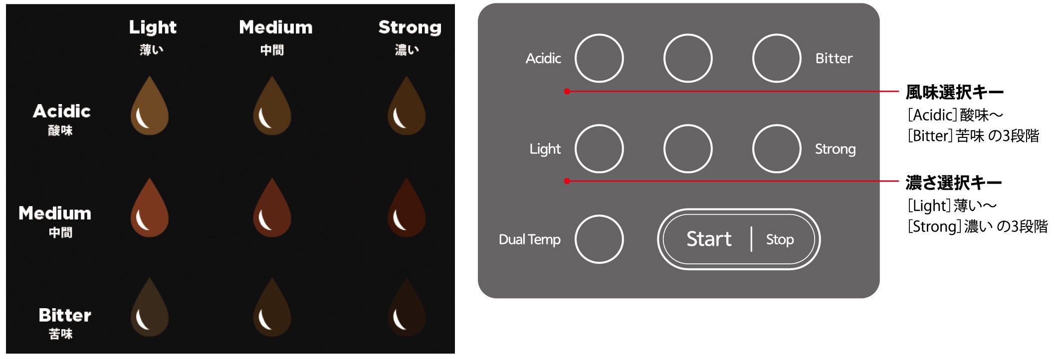 風味と濃さの選択キーを押すだけで 「Siphonysta」が抽出過程の温度や時間、攪拌方法を自動調整、 その時の気分に合わせたお好みの味をお届けします。
