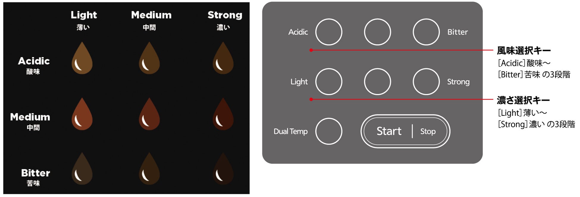 抽出過程で温度を切り替えてコーヒー豆の本来の風味を引き出す、 Dual Temp(2段階温度抽出)機能のモードを搭載。 雑味を押さえ、よりコーヒー豆の風味を楽しんでいただける抽出方法となり、従来の抽出方法では実現しえなかった濃厚で革新的な味わいを実現します。