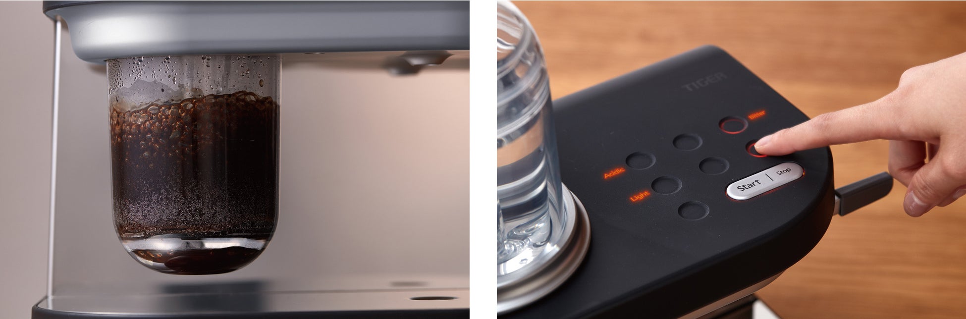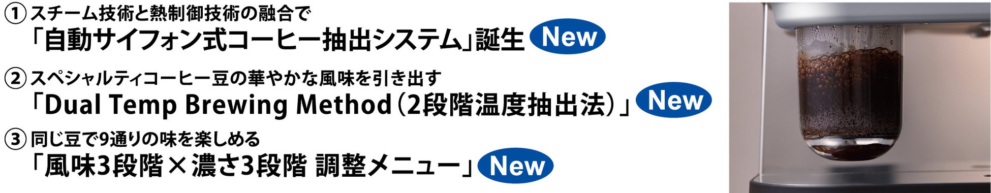 当社が長年培ってきた“スチーム技術”と“熱制御技術”を駆使して作り上げた逸品です。瞬時にコーヒー粉全体を蒸らすスチームを発生させ、一般的なドリップ式ではない浸漬式を採用。シリンダーの上下に圧力差を発生させてコーヒーを減圧ろ過して、抽出を行う新しい方式です。クリアーでかつ、豆本来の香りと旨みを最大限に引き出します。