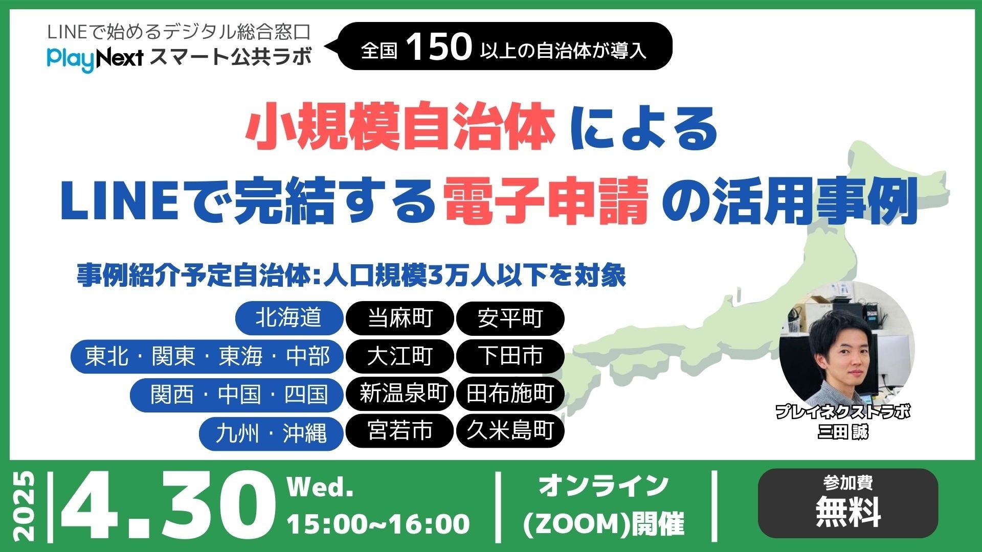 プレイネクストラボ株式会社(本社:東京都品川区、代表取締役:柏 匠、以下 プレイネクストラボ)は提供中の行政DXサービス「スマート公共ラボ」の最新事例セミナーを無料で4月30日(水)15時より開催します。