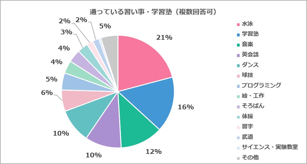 アンケートによると、88%のお子様が習い事を利用。利用している習い事は「水泳(21%)」、 「学習塾(16%)」、「音楽(12%)」などの回答がありました。