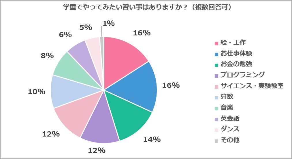 放課後児童クラブでやってみたい習い事は「絵・工作(16%)」、「お仕事体験(16%)」、「お金の勉強(13%)」がトップ3となりました。