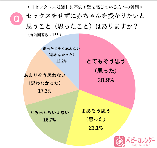 少し話は飛躍しますが、「セックスレス妊活」に悩んでいるママ(158名)に、セックスをせずに赤ちゃんを授かりたいと思うことはあるかという質問もしています。結果は、思う(思ったことがある)との回答が5割を超えました。理由は人それぞれあるとは思いますが、子どもは欲しいけれど、セックスはつらい、したくない、できない……となってしまう要因には、前述した「セックスレス妊活が解決しにくい理由」の回答にもあるように、夫婦間においてもセックスに関して話題にしづらいという背景もあると推察されます。