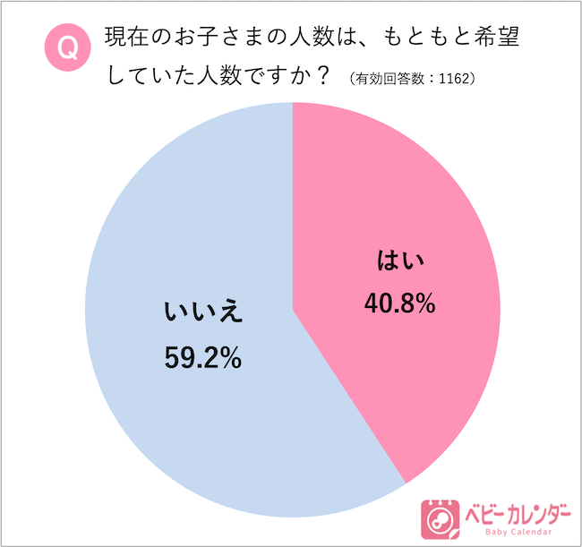 現在妊娠中(第2子以降)または育児中のベビーカレンダー会員のママ1162名に、「現在のお子さまの人数は、もともと希望していた人数ですか?」と質問したところ、59.2%が「いいえ」と回答しました。回答者の現在の子どもの数は、「1人」(52.9%)「2人」(32.8%)という結果で、アンケートの回答者の8割以上が「子どもは2人以下」とわかっています。「子どもは2人以下」の6割近くが、希望の人数を出産していないというのが現状だといえるでしょう。