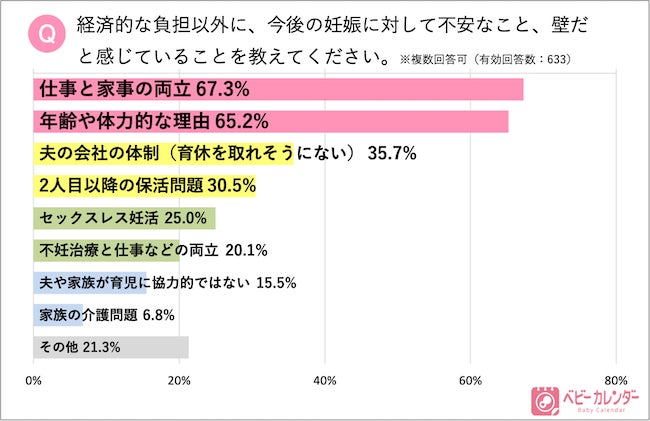 今回のアンケートで見えてきた、経済的な負担以外にも立ち塞がる2人目(以降)をちゅうちょする「壁」。アンケートでは、それぞれの問題に対し、その壁が少しでも解消されたら2人目(以降)の妊娠を希望するかも尋ねています。どの問題にも多くのママが「はい」と答えていて、その平均は8割弱。少子化対策には、経済的支援だけに頼らず幅広いフォローの必要性を強く感じました。ベビーカレンダーは、今後も少子化に関する調査・分析等を続け、人々のリアルな声から根源的な理由を探り、その結果から明らかになった少子化問題の抜本的な解決に向けて、国や自治体に働きかけていきます。
