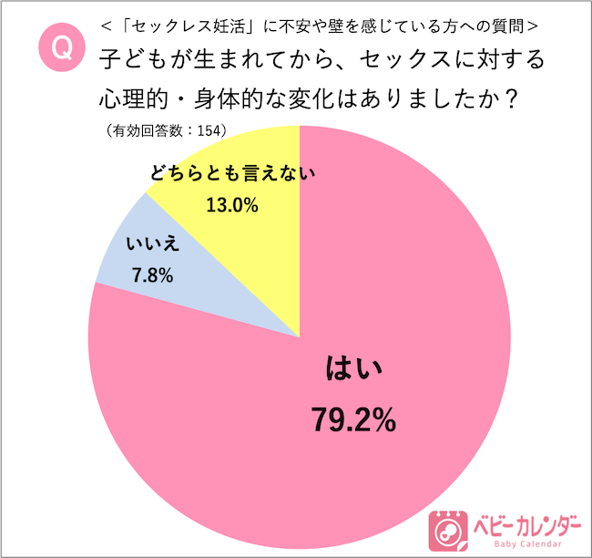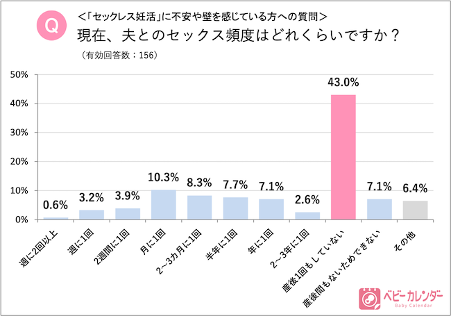 「セックスレス妊活」とは、妊娠を希望していても何らかの理由で性交ができない状態のことをいいますが、前述したように、今回のアンケートでは2割以上が「セックスレス妊活」に悩んでいることがわかりました。また、「セックスレス妊活」に悩むママたちの約8割が、出産後にセックスに対する心理的・身体的変化を感じていたことや、産後1度もセックスを再開できていない夫婦が約4割いるという回答も。セックスを再開できないという人の中には「セックスを再開することに対し身体的な不安を感じる」「会陰切開の傷跡が痛すぎてできない」という声もあり、産後のセックスに対するケアや、夫婦間での知識の共有など、今後も今まで以上に正しい情報発信の必要性を感じます。