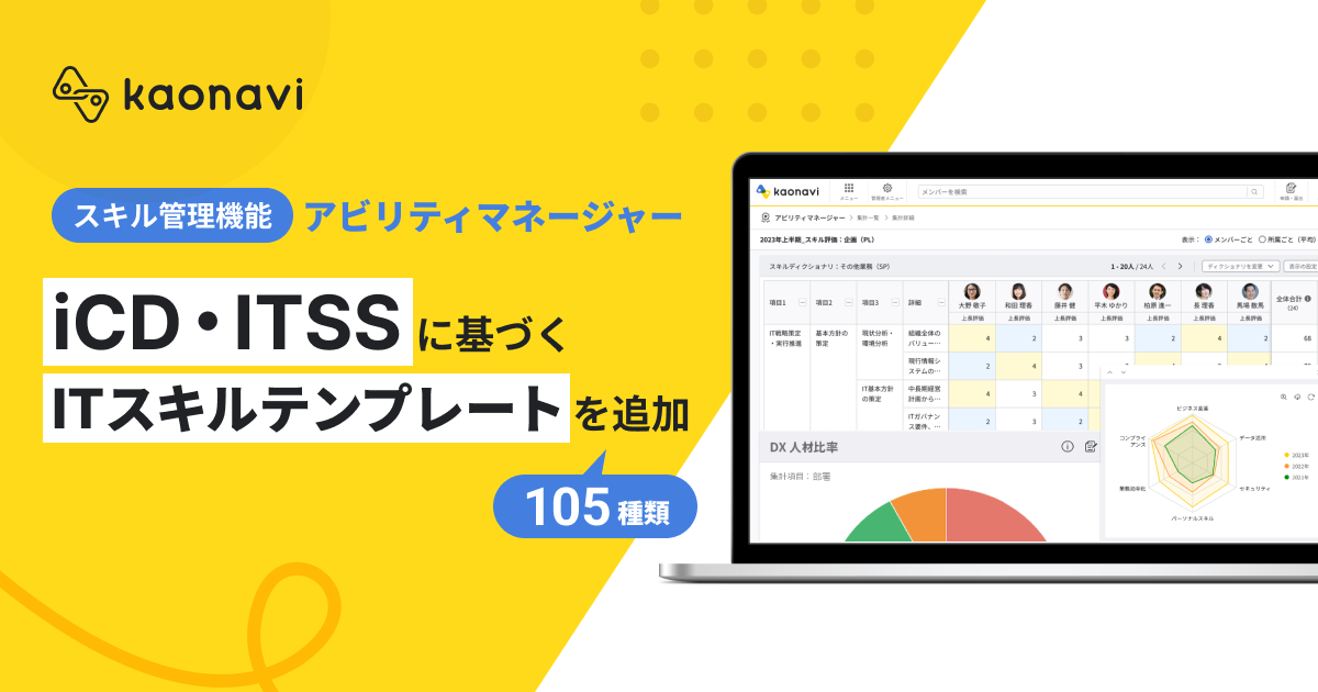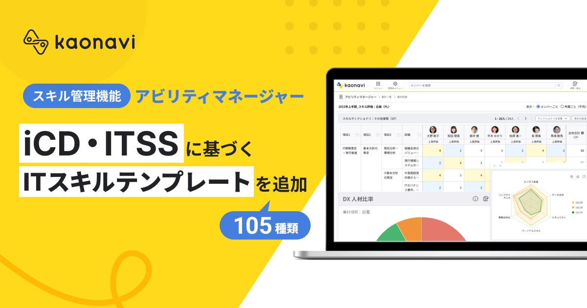 この度、「カオナビ」のスキル管理機能「アビリティマネージャー」にiCD、ITSSに基づいたテンプレートを追加することで、複雑なITスキルを業界基準に則って管理できるようになります。これにより、各社が必要とするITスキルの強化に向け、より適確な人事施策を進められます。