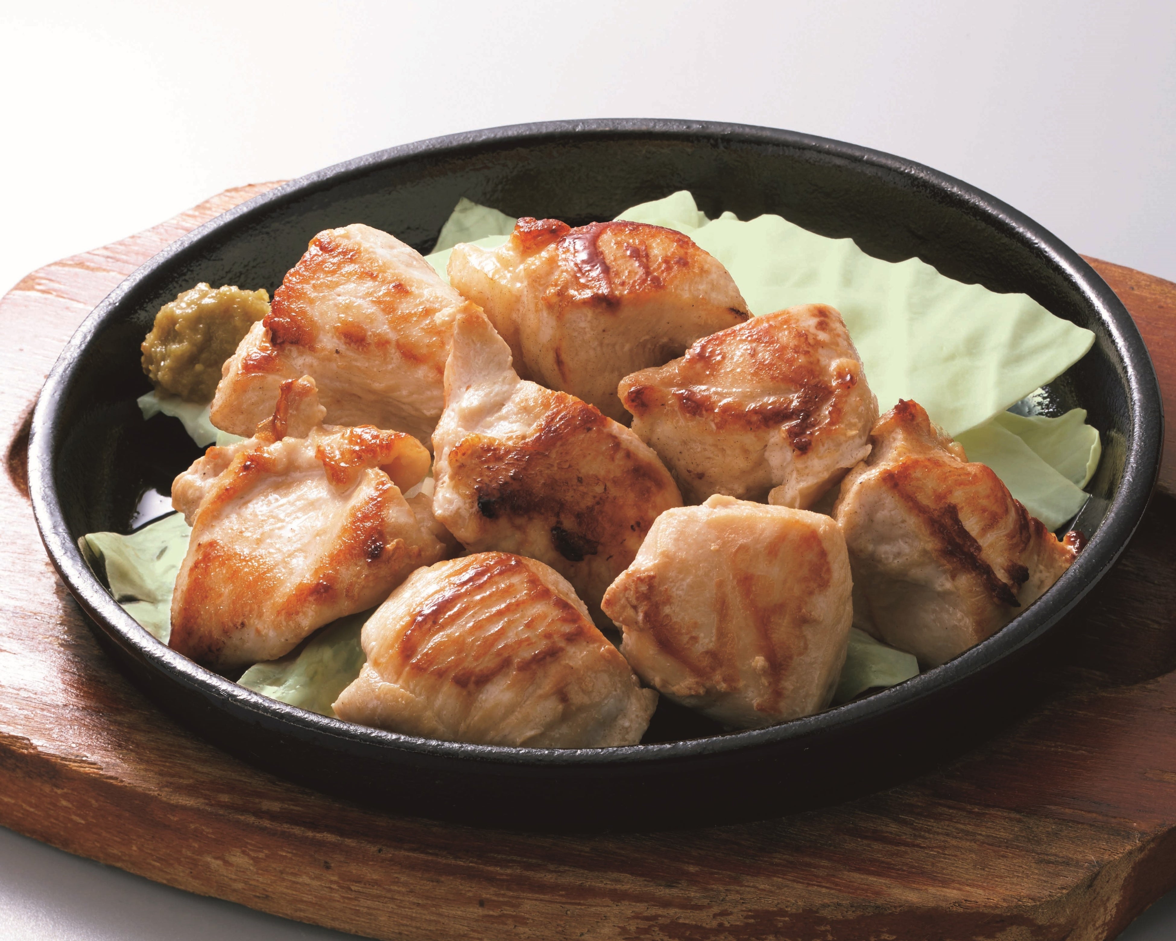 自然豊かな指定農場で育てられた「ありたどり」を使用。こだわりの飼料と環境で育てられた鶏肉は、コクと旨みが凝縮されています。極上ももはジューシーで食べ応えがあり、熟成むねはやわらかく上品な味わい。熱々の鉄板で焼き上げ、柚子胡椒を添えてご提供いたします。