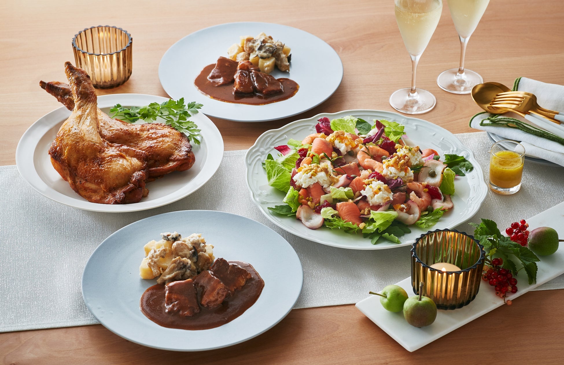 桜島どりの骨付きもも肉のロースト 2個/黒毛和牛の赤ワイン煮込み ポテトとキノコのフリカッセ添え 2パック/海老・スモークサーモン・タコの華やぎサラダ 1パック