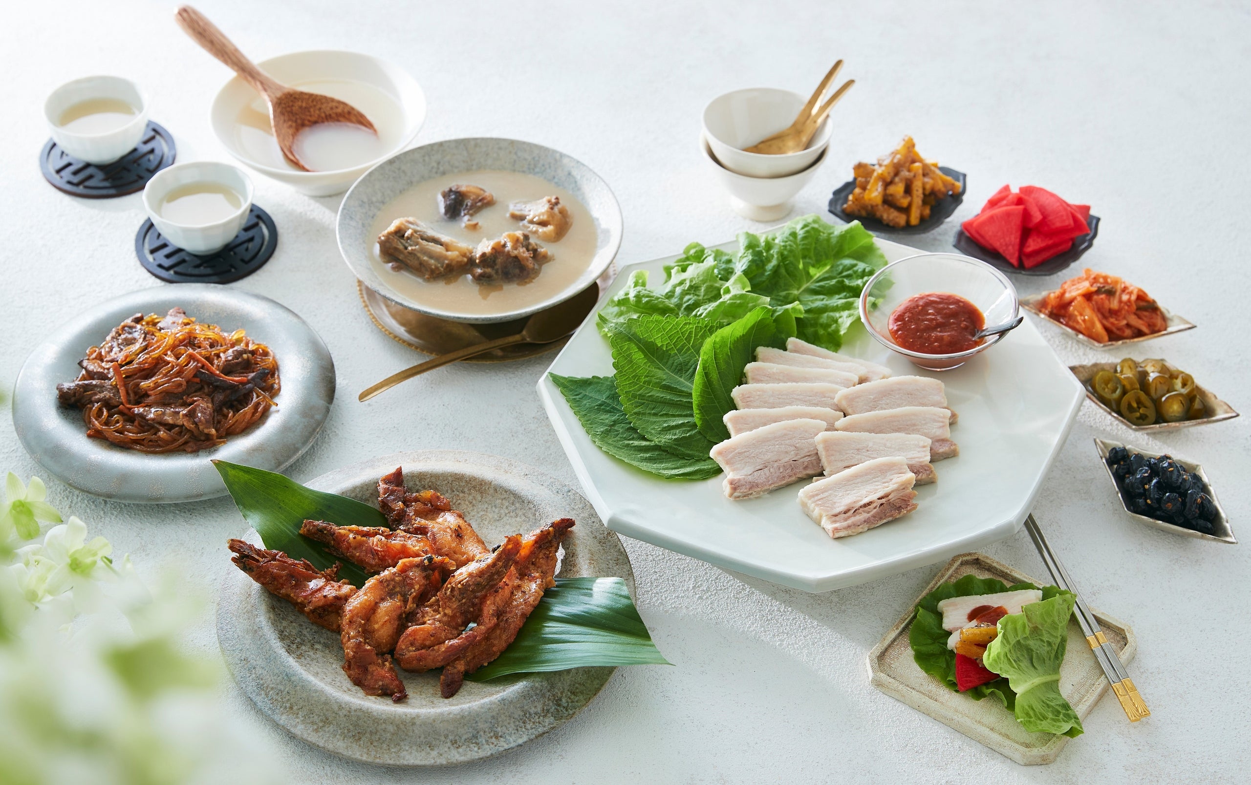 ポッサム(茹で豚 190g、黄人参ナムル、紅心大根の甘酢、青唐辛子の酢漬け、黒豆、キムチ、コチュジャンたれ)/プルコギチャプチェ 200g/ソフトシェルシュリンプのハニーガーリックソース(海老 6尾)/牛テールスープ 450g ※商品に葉野菜は含まれません。
