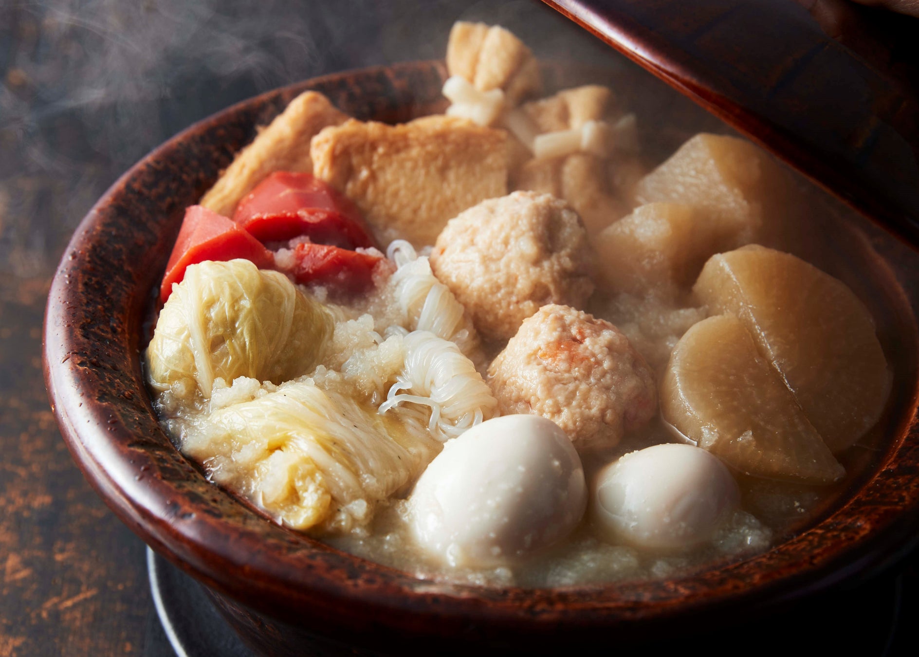 岩手で育てた絶品鴨と豚肉の白菜巻き/平天・結び糸こんにゃく・海老しんじょう/大根・金時人参/玉子・もち巾着/かぶらみぞれ/柚子七味 2P