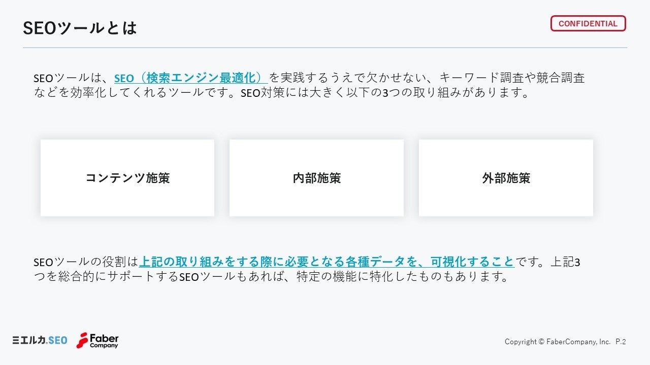 Faber Companyが10年以上にわたる検索エンジンマーケティングの知見をもとに、AIを活用して開発したSEOプラットフォーム。(1)コンテンツ企画・制作・評価・改善に加え、競合サイトを含むSEOパフォーマンス計測ができるツール、(2)セミナーや動画など自律的に学べる学習コンテンツ、(3)個別コンサルティング の三位一体で、インハウス(導入企業内)でのSEO・コンテンツ施策を支援する。