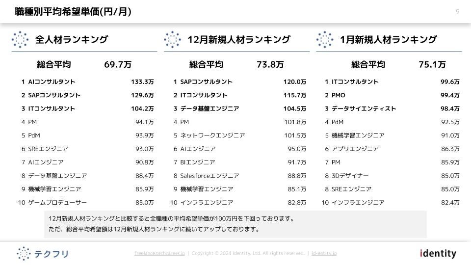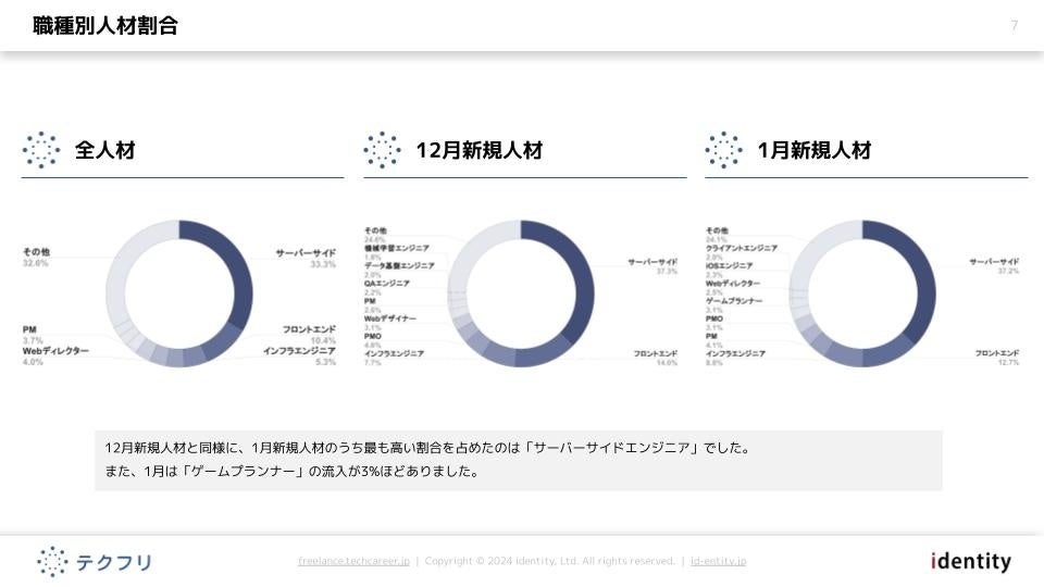 ITフリーランスエンジニアの案件・求人サイト「テクフリ」(https://freelance.techcareer.jp/)を運営する株式会社アイデンティティー(東京都新宿区、代表取締役:今野 力、以下「当社」)は、テクフリのデータベースをもとに2025年1月における人材の市況感を調査しました。より詳しい結果については、お問い合わせから資料請求が可能です。