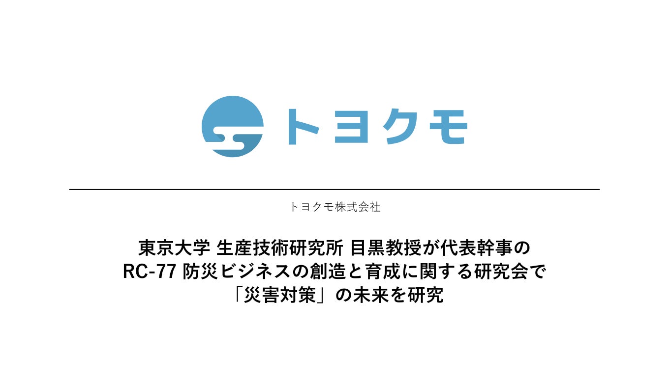 誰でも簡単に使えるビジネス向けのクラウドサービスを提供するトヨクモ株式会社(本社:東京都品川区、代表取締役社長:山本裕次、以下トヨクモ)は、この度、東京大学生産技術研究所の目黒公郎教授が代表幹事をつとめる一般財団法人生産技術研究奨励会の特別研究会「RC-77研究会(防災ビジネスの創造と育成に関する特別研究会、以下研究会)」に参加することを発表します。