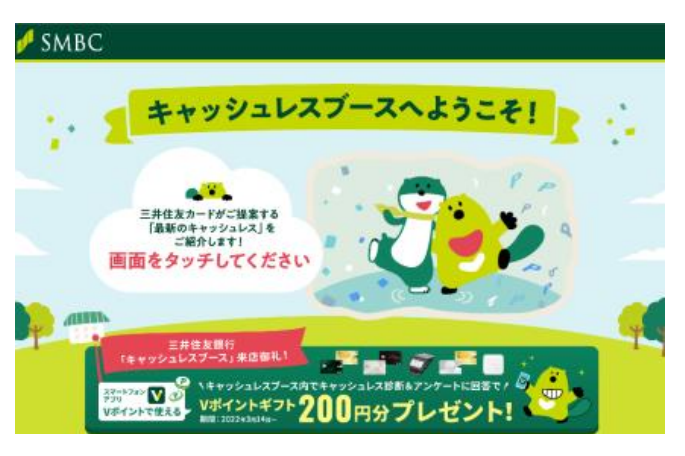 | ~「アンケートご回答でVポイントギフト200円分プレゼント」~ 「キャッシュレス診断」体験後、アンケートにご回答頂いたお客さまに、Vポイントギフト200円分をプレゼントいたします。 Vポイントギフトは、スマートフォンアプリ「Vポイント」にチャージすることで、店頭での決済(Visaのタッチ決済/iD)、Visaが使えるネットショッピングでご利用いただけます。 ※QRコードの読み取りが必要なため、スマートフォンのご利用が必要です。 QRコードは株式会社デンソーウェーブの登録商標です。 ※特典の付与は、おひとり様につき1回限りです。 ※「iD」は株式会社NTTドコモの商標です。 ※本プレゼントは事前の予告なく、終了する場合がございます。 詳細は以下ホームページをご確認ください。 https://www.smbc-card.com/nyukai/for_cashlessbooth/cardinfo4010511.jsp |