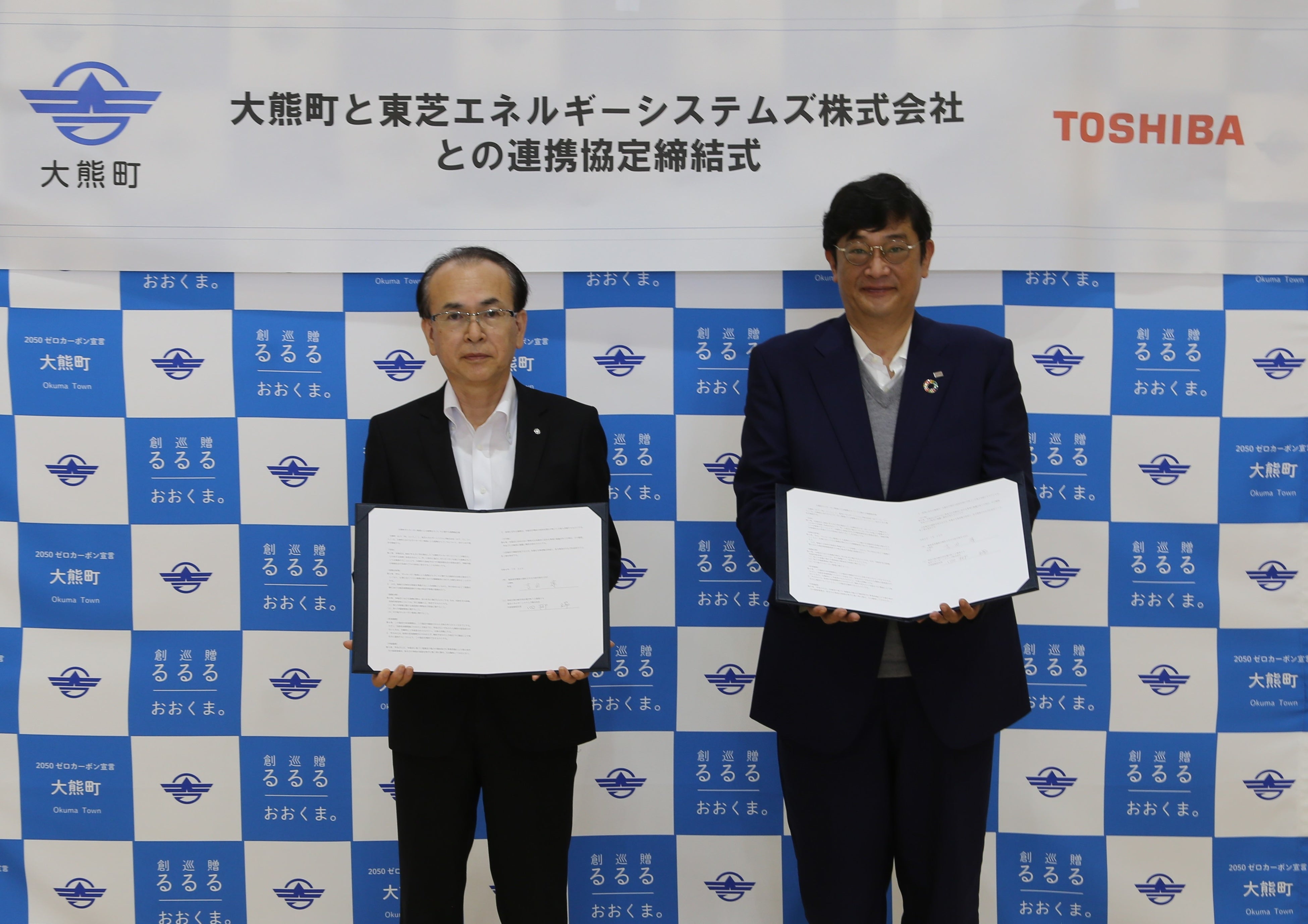 福島県大熊町(以下、「大熊町」)と東芝エネルギーシステムズ株式会社(以下、「東芝エネルギーシステムズ」)は、本日「ゼロカーボン推進による復興まちづくりに関する連携協定書」を締結しました。