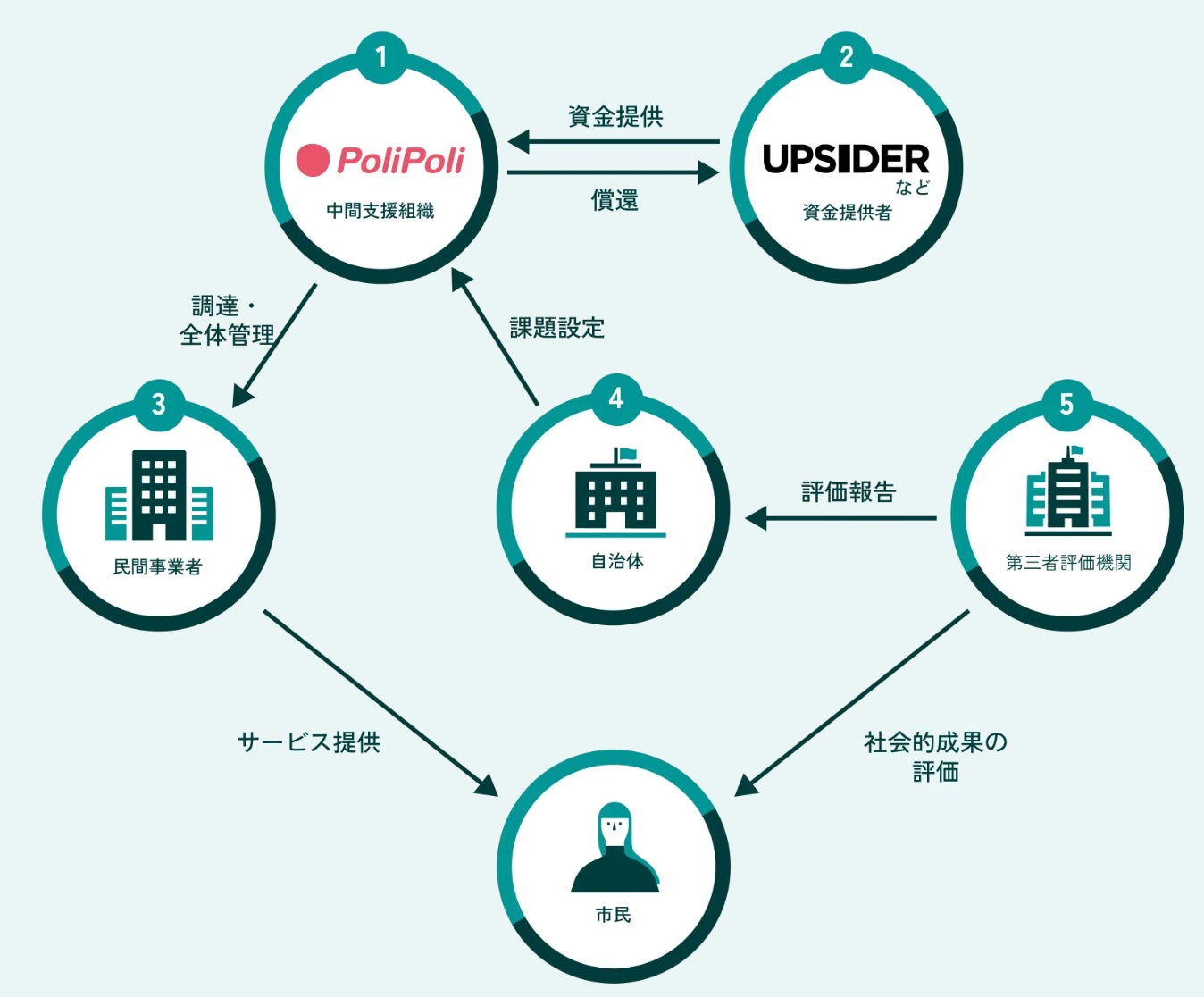 『自治体共創ファンド』は、ソーシャル・インパクト・ボンド(SIB)を活用して地域課題の解決を推進するための事業です。PoliPoliが、地域課題を解決したい自治体・課題解決のノウハウや実績を有する事業者・案件に資金提供を行う資金提供者を募り、中間支援組織及び資金提供者として案件をリードします。