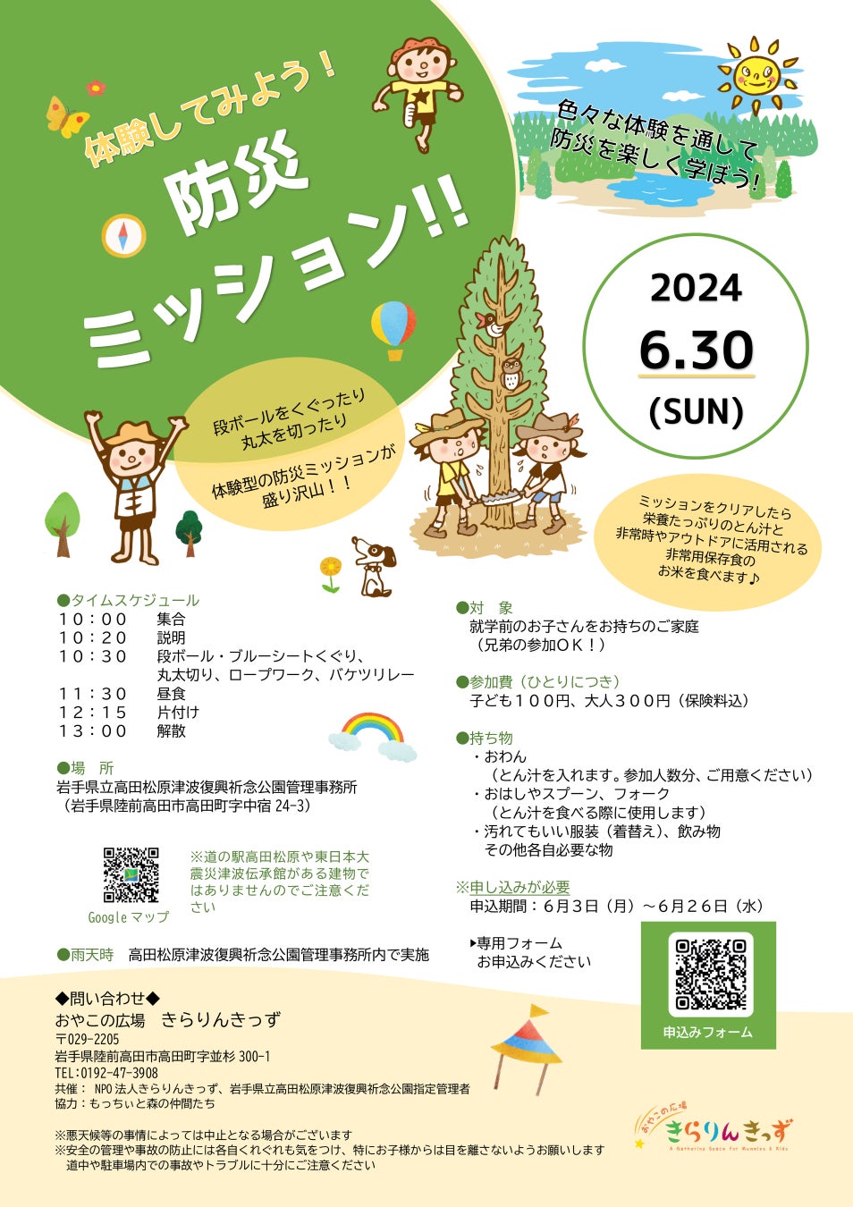 岩手県立高田松原津波復興祈念公園では、6月30日(日)に「NPO法人きらりんきっず」との共催で、市民協働による防災イベント「体験してみよう!防災ミッション‼」を開催します。対象は、未就学児とその家族。遊びの要素を加えた体験や、備蓄食の試食を通して、親子で楽しみながら防災を学ぶことにより、防災意識を高め、緊急時の対応力を強化します。