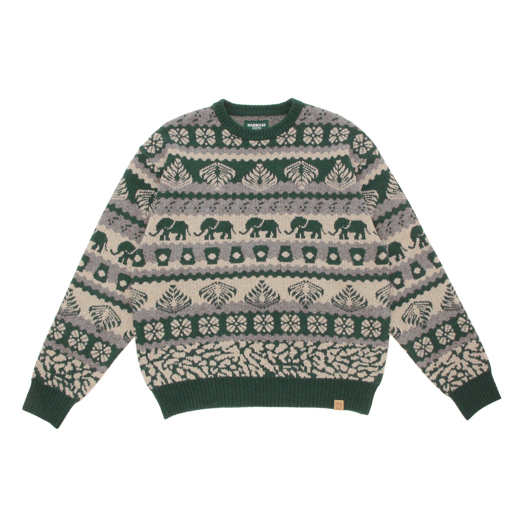 ジャカードクルーニットは、オリジナルの柄を制作し、ジャガードで表現した5GGウールニットです。アフリカゾウやラテアート、スターバックスのカップやコーヒー豆が遊び心たっぷりに描かれています。裏針抜きのウールジャガード編みにすることで、メランジ感もありつつ発色を良くさせオリジナル柄をはっきり表現しています。またウール100%による膨らみと触り心地の良さが高級感のあるアイテムに仕上げました。シルエットは、肩幅と身幅にゆとりを持たせ、袖口・裾はリブ仕様、またネックはできるだけ身体に沿わせるように設定しメリハリのあるシルエットに調整。ユニセックスでも着用できるようXS〜XLまでの5サイズ展開です。