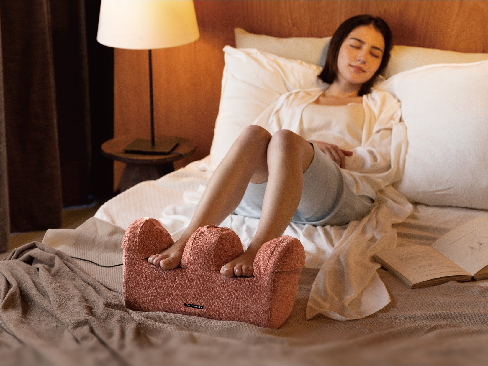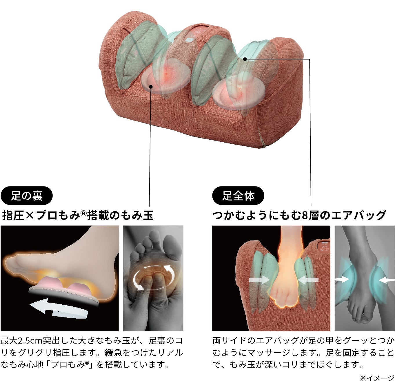 新たに搭載したもみ玉と両足合計8層のエアバッグにより、足裏、左右両側からマッサージしコリをもみほぐします。もみ玉にはマッサージクッションにも搭載している、当社独自のもみ速度「プロもみ®」を採用し、緩急をつけた リアルなもみ心地です。また、ヒーターを内蔵し温めながら心地よくマッサージします。