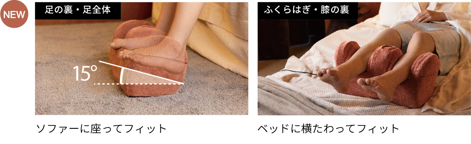 マッサージ部分が約15度傾斜する設計により、仰向けになった際の足裏やふくらはぎ・膝裏、座った状態の足裏の姿勢に自然にフィットします。