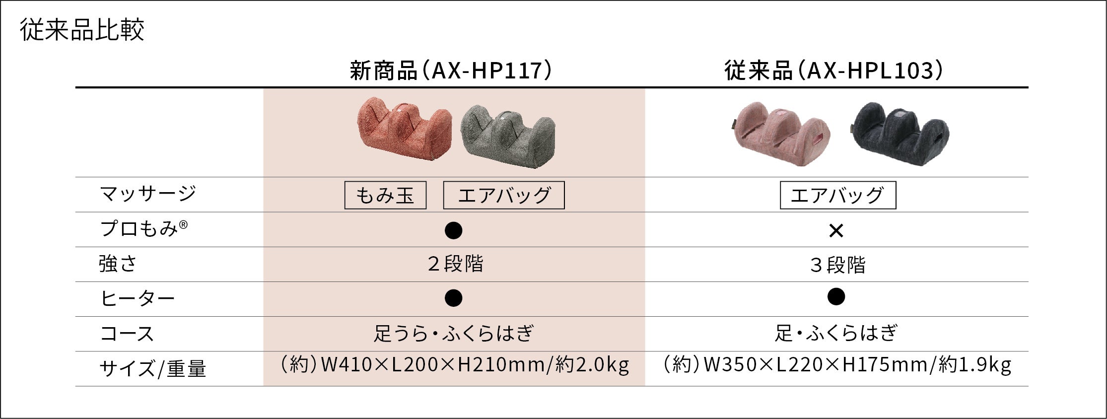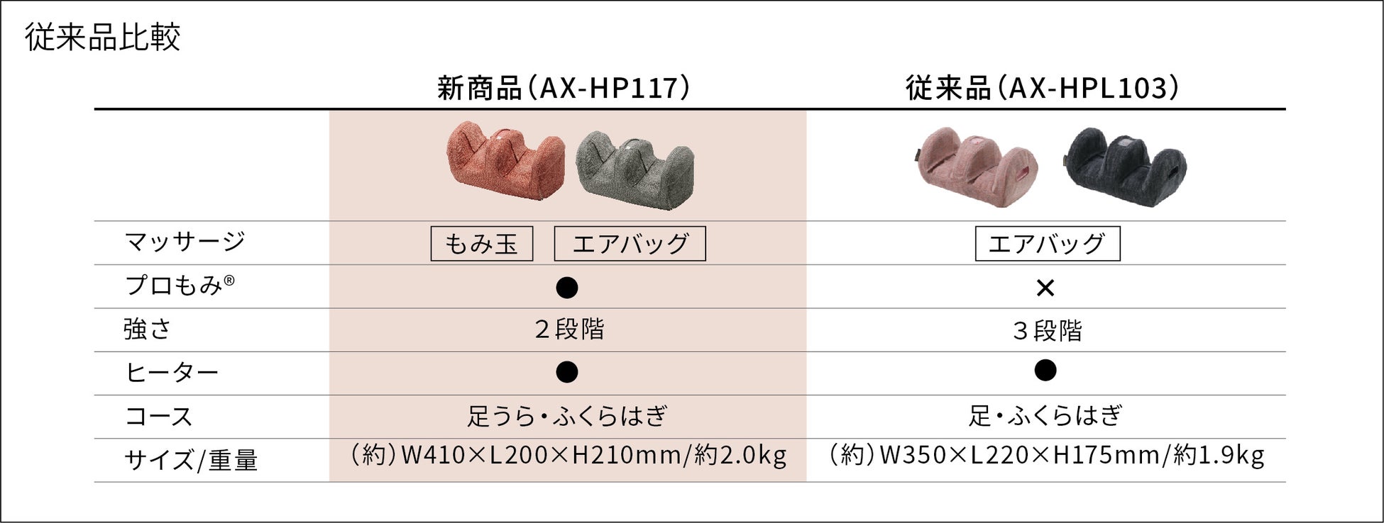 スペースを取らないコンパクトさと、インテリアになじむデザインを兼ね備えた従来品(AX-HPL103)にもみ玉を新たに追加しました。当社独自のもみ速度「プロもみ®(リアルに近いもみ心地を目指した技術)」も搭載し、エアバックともみ玉で同時にマッサージすることで、疲れた足をしっかりもみほぐします。