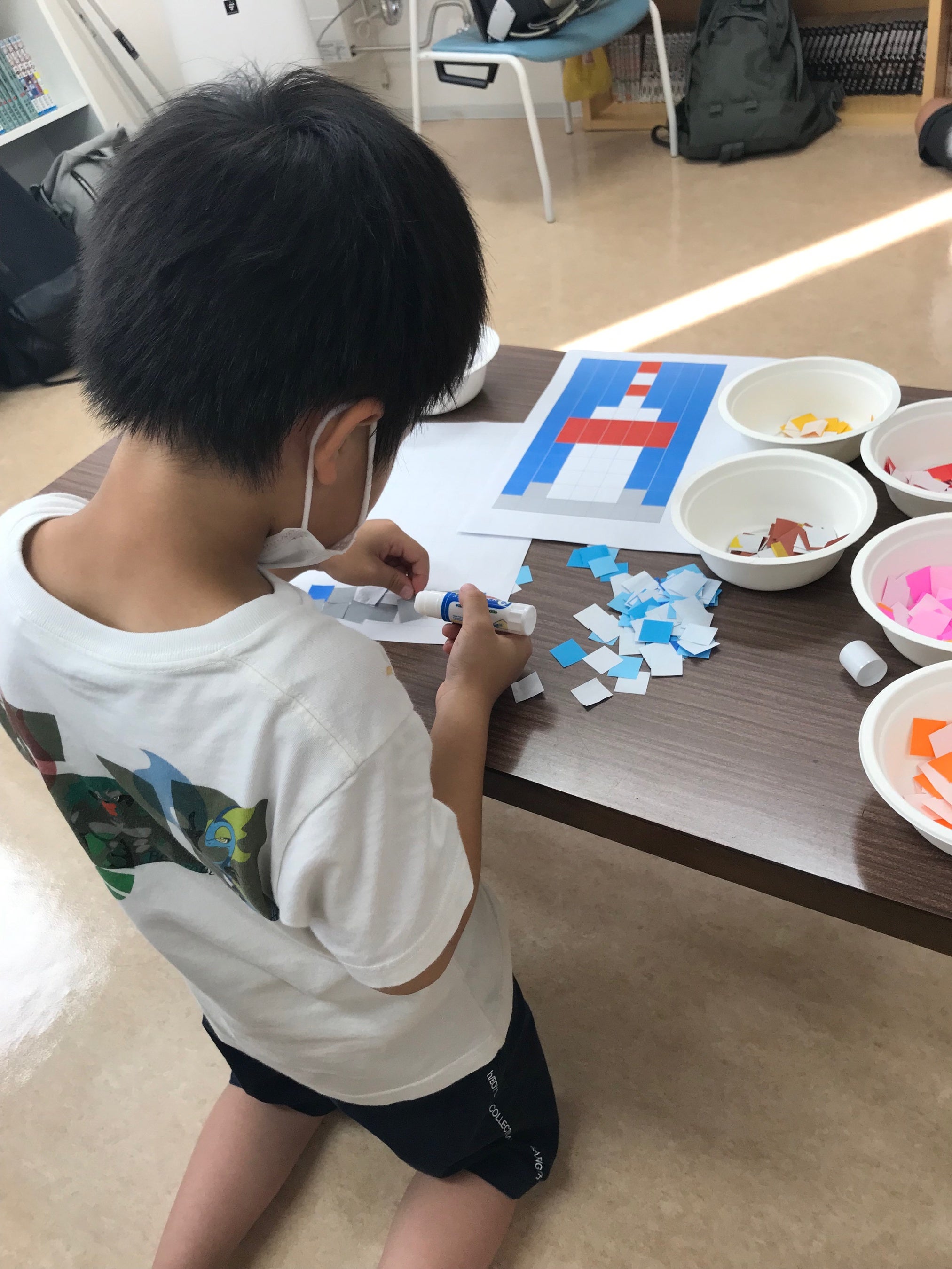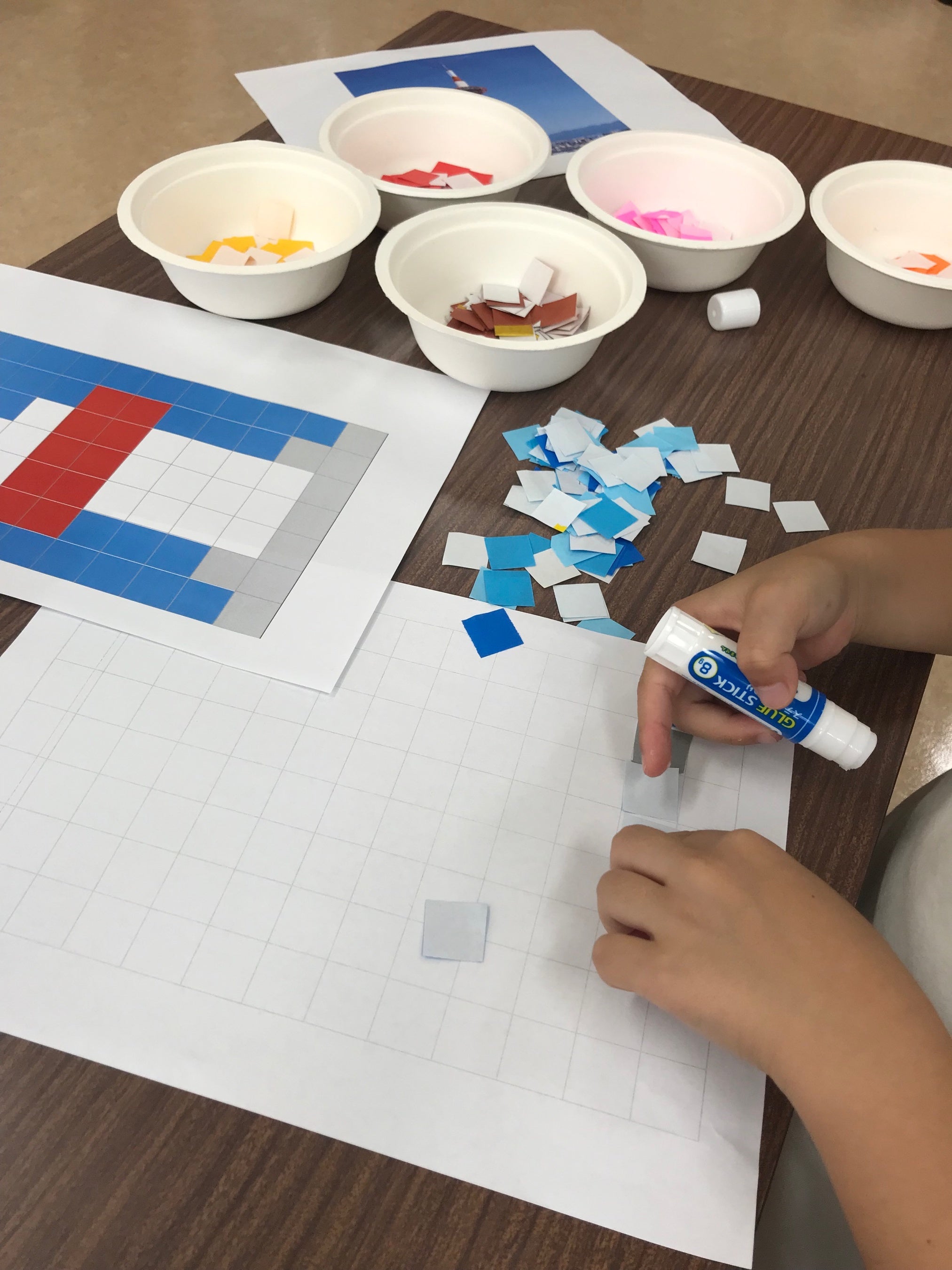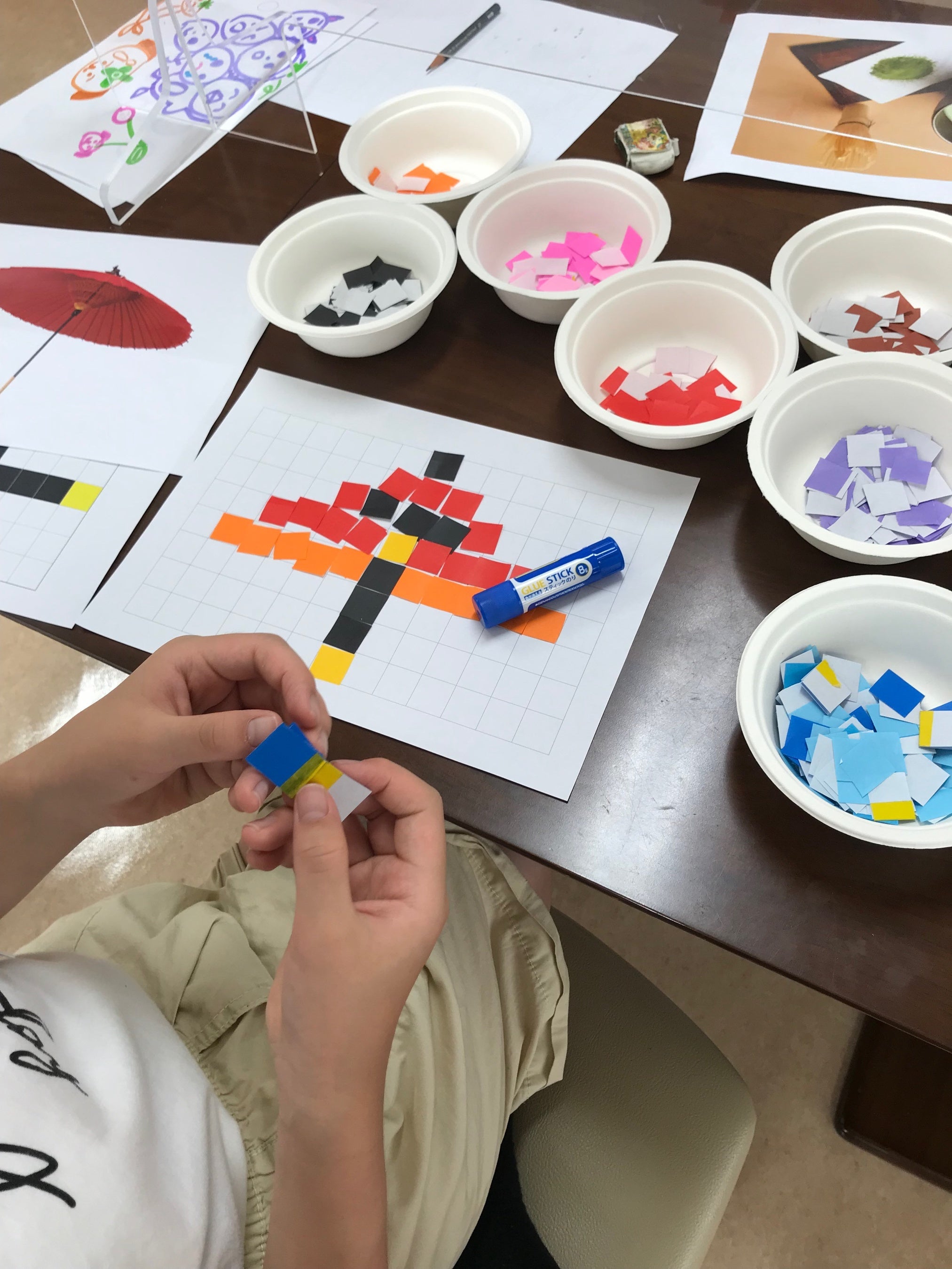 第2回目では、「京都をイメージしたピクセルアートをつくってみよう!」をテーマとし、第1回目のプログラムで学んだ京都の伝統的な食べ物・工芸品・観光名所などについて、折り紙を用いて、ピクセルアートとして創作しました。子ども達は、それぞれすきな題材を選び、それぞれのピクセルアートづくりを楽しみました。京都についての興味を喚起された子ども達は、「八つ橋をたべてみたい!」「キラキラの金閣寺をみてみたい!」などと言いながら京都に思いをはせながら作品をつくることができました。