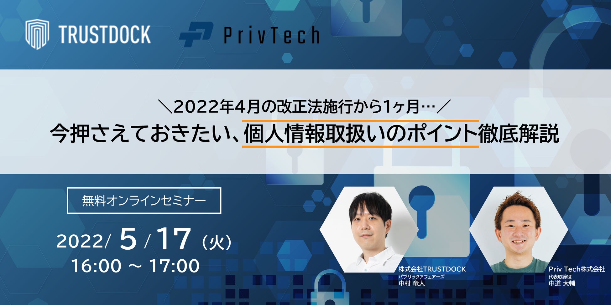 本イベントでは、プライバシーテック領域をリードするPriv Tech株式会社 代表取締役 中道大輔氏とオンライン本人確認eKYCの株式会社TRUSTDOCK パブリックアフェアーズ 中村 竜人が今般の個人情報保護法改正のポイントを改めて概観しつつ、個人情報の取扱いに配慮した企業の取組み等について事例を交えながらご紹介いたします。