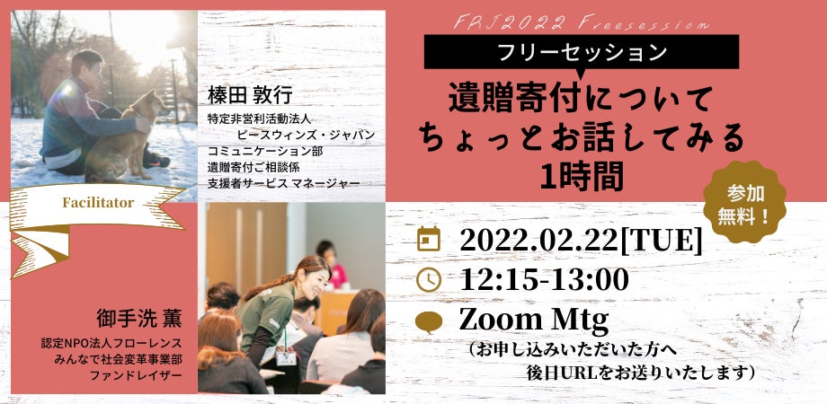 - 事前申込み 必要 https://frj2022fs-legacygiving.peatix.com(後日、参加用のZoom URLをご案内いたします)