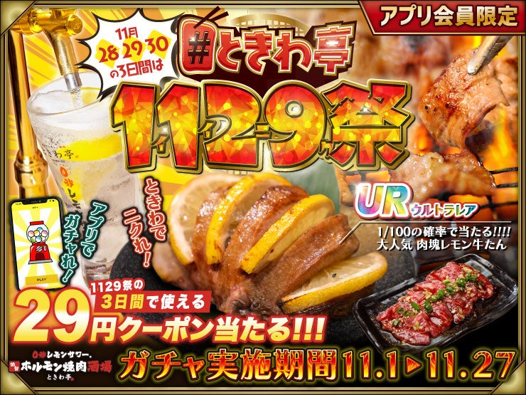 この度、11月28日(月)〜11月30日(水)の「いい肉の日」を含む3日間限定で、『11/28、29、30は #ときわ亭1129(いいにく)祭』キャンペーンを開催いたします。11月1日(火)時点でアプリ会員の方、また、11月1日(火)〜11月27日(日)の期間に新規会員登録していただいた方に、キャンペーン期間中に使えるクーポンが当たるガチャチケットをアプリから配信します。クーポンは、「肉塊レモン牛たん」「ときわ亭カルビ」「塩ホルモン」「0秒レモンサワー飲み放題60分」がそれぞれ29円という破格でハズレなしです。