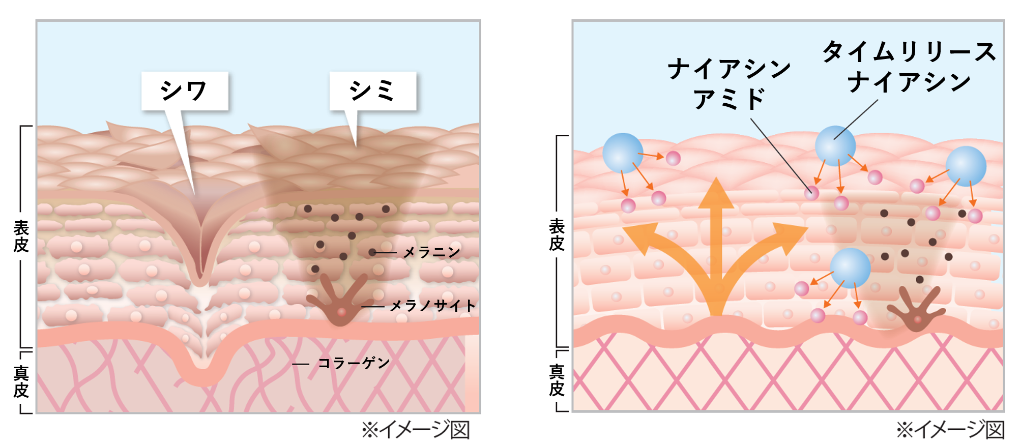有効成分「ナイアシンアミド」は、肌を奥からグッと押し上げシワを改善。また、メラニンの生成を抑え、シミを防ぎます。さらに、「タイムリリースナイアシン※3」を配合し、肌のすみずみに浸透※6しながら「ナイアシンアミド」を徐々に放出することで、1日中継続的なシワ改善と美白※2ケアをサポートします。
