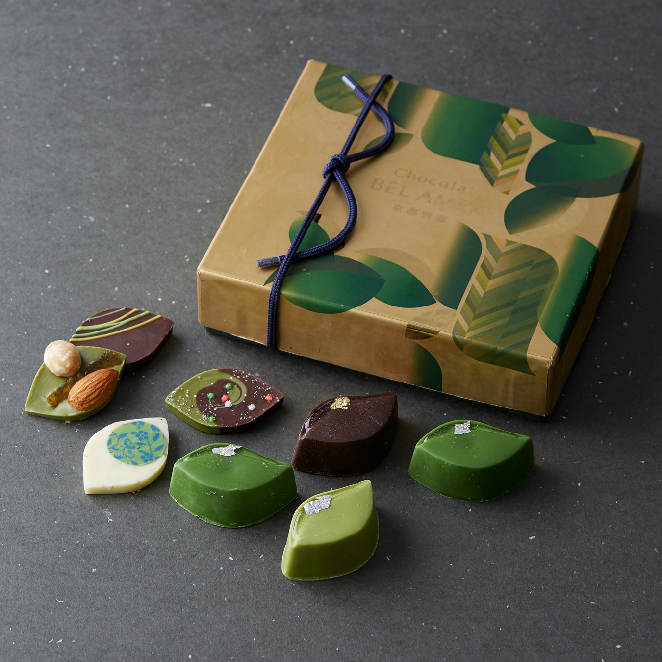 「金の抹茶ショコラアソート」は、"金の抹茶®"を使用したボンボンショコラと葉型のタブレット型チョコレートの詰め合わせ。