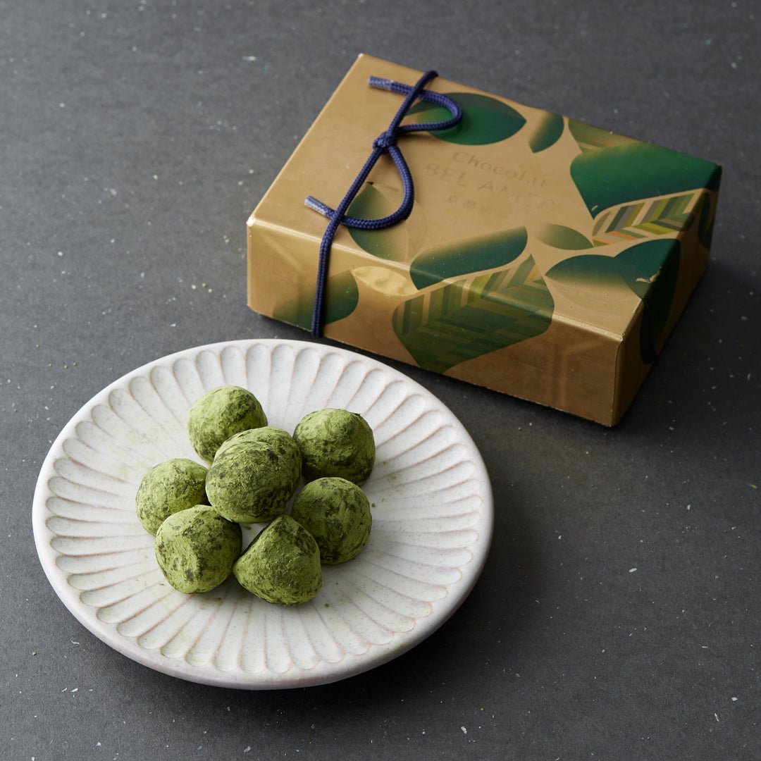 「金の抹茶トリュフ」は、"金の抹茶®"と白胡麻を使用したキャラメル風味のチョコレートを合わせ、仕上げに抹茶をまぶした、口どけなめらかなトリュフです。