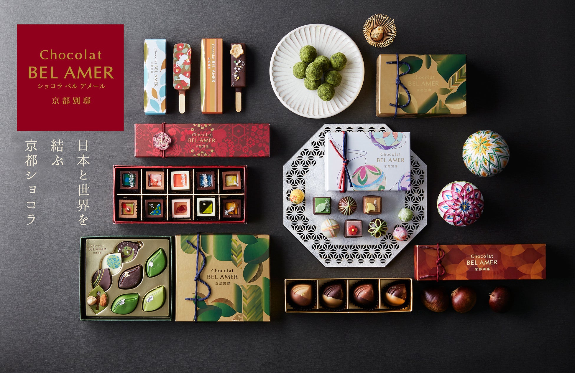 「ベルアメール 京都別邸」の期間限定ショコラコレクション。国産素材にこだわり素材を吟味し、厳密に湿度や温度を管理した専門アトリエでひとつひとつ丁寧にお作りしたショコラの数々をお届け致します。
