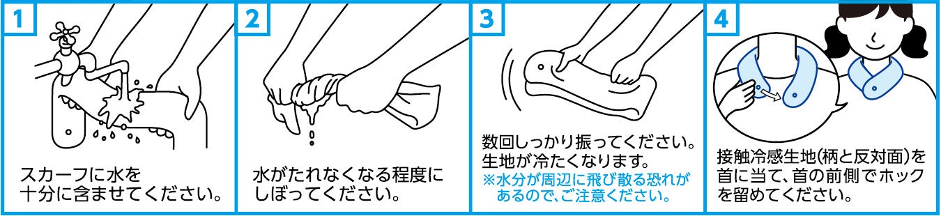●水にぬらし、しぼって振るだけで、冷たいスカーフに早変わり!