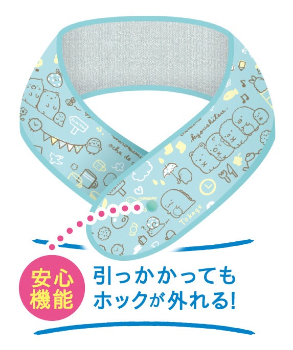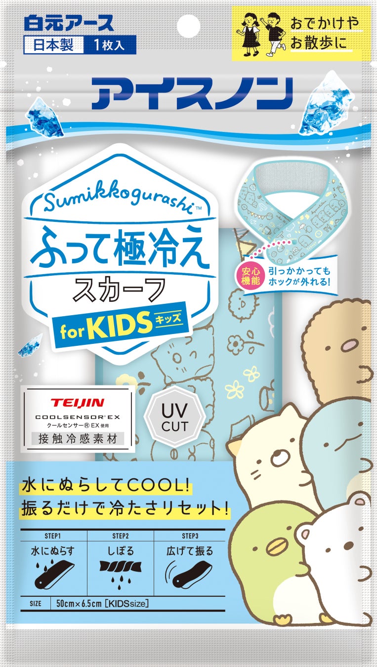 『アイスノン ふって極冷えスカーフ すみっコぐらし』は、水にぬらして、しぼって振るだけで、冷たいスカーフに早変わりする気化熱を利用した商品です。冷たさを感じなくなったら、スカーフを再び振ることで、冷たさが復活し、乾くまでくり返し使えます。肌にあたる側は、熱の拡散力に優れたテイジンの接触冷感素材“COOLSENSOR®EX”を使用しています。熱伝導性が高い素材と風を通しやすい製法で作ることで、熱の拡散と水分の気化を促進し、高い冷却効果が得られます。また、表の生地は綿100%のガーゼ素材で、今回、子供にも人気のキャラクター「すみっコぐらし」を起用した限定デザインとなっています。
