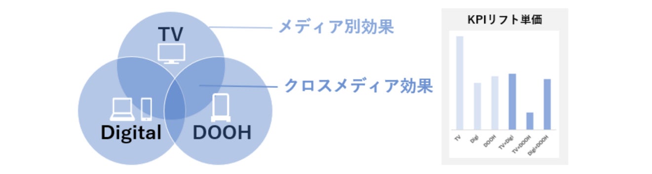 また、テレビ×DOOH、デジタル×DOOHなどの各メディアの重複接触効果を可視化することができ、最適なメディアの組み合わせを検証することができます。