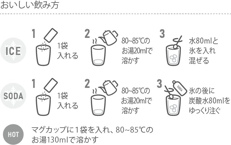 少量のお湯でパウダーを溶かした後、お好みに応じて水もしくは炭酸水を注ぎ、氷を入れて完成です。