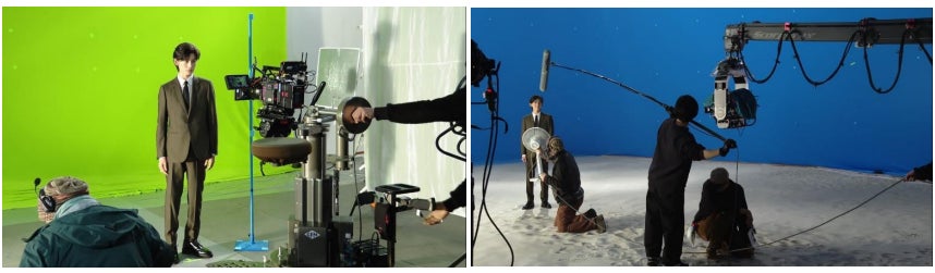 若手社員役を演じる高橋文哉さん。タイトなカーキのスーツを身に纏い、早朝からの撮影現場にも関わらず「おはようございます!」と元気よくスタジオ入り。昨年10月に入れ替わった大井競馬場のコースの砂をイメージした「プラチナ」に輝く砂が敷かれたスタジオで撮影がスタート。CM現場では珍しい砂の登場に、文哉さんは実際に走った場所を自らの手で平(なら)したり、撮影の合間に砂を集めて山を作ったりと興味深々の様子。また、砂の上を歩くシーンの撮影では、関係者のヒールを気遣い「大丈夫ですか?痛くないですか?」と声をかけるなど紳士な一面を見せました。普段あまり見ることのない砂を前にした文哉さんの無邪気な一面や紳士的な一面に、スタッフ陣も魅了され、終始和やかな雰囲気で撮影が進みました。