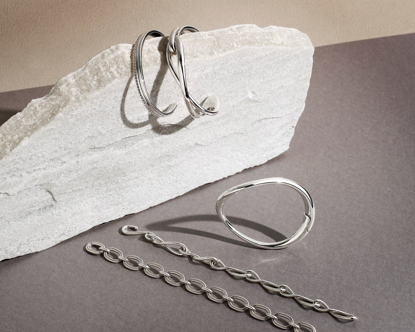 手元で存在感を放つバングルやたっぷりとしたボリュームのチェーンブレスレットなど夏の装いをクラスアップするアイテムがラインナップ。