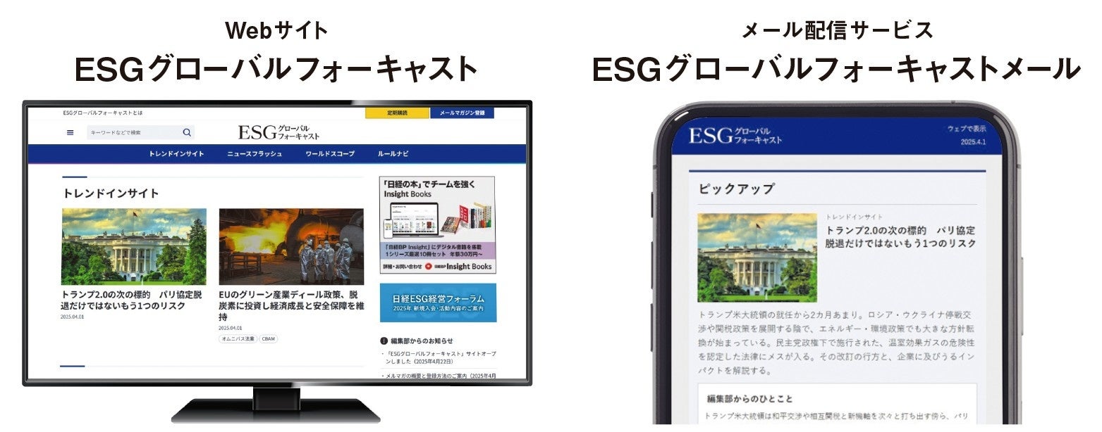 株式会社日経BP(本社:東京都港区、社長CEO:井口 哲也)は2025年4月22日、ESG(環境・社会・企業統治)分野の規制や政策に特化したデジタルメディア「ESGグローバルフォーキャスト」をオープンしました。ESG専門誌「日経ESG」が手掛ける、専門情報をさらに深掘りする新メディアです。世界や国内で進む規制の議論が企業に与えるインパクトを解説する記事など、企業のサステナビリティ戦略立案に役立つ情報を提供していきます。4月22日からはプレオープン期間とし、25年後半に本格サービスを開始します。
