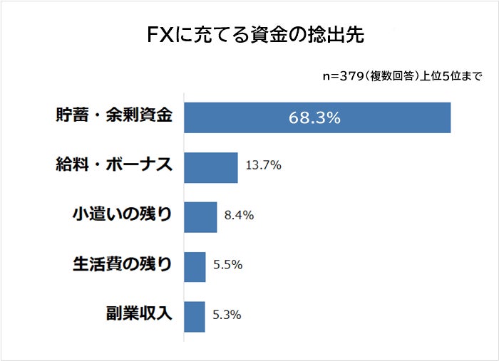 「FXにあてる資金をどこから捻出しているか」を聞いたところ、1位になったのは「貯蓄・余剰資金(68.3%)」でした。2位「給料・ボーナス(13.7%)」、3位「小遣いの残り(8.4%)」と続きます。
