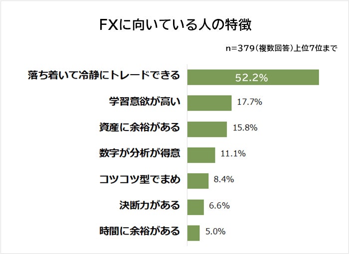 1位になったのは「落ち着いて冷静にトレードできる(52.2%)」でした。2位「学習意欲が高い(17.7%)」、3位「資産に余裕がある(15.8%)」、4位「数字や分析が得意(11.1%)」と続きます。