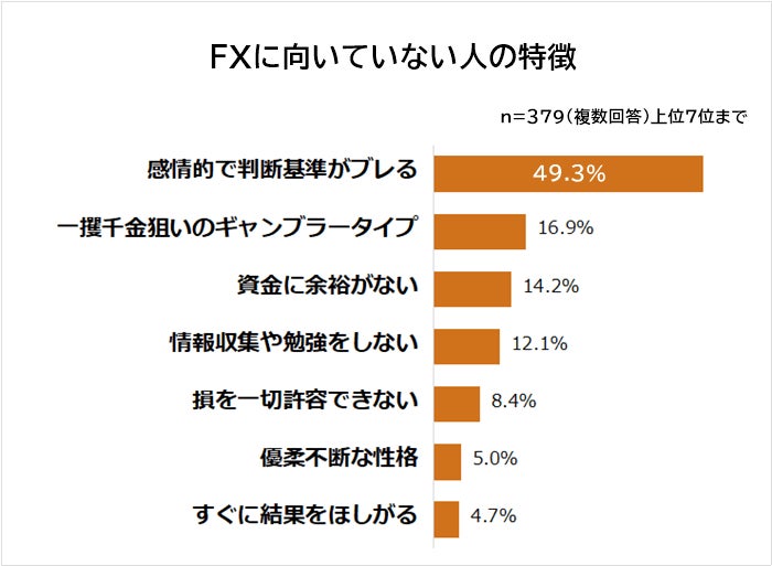 その結果、1位になったのは「感情的で判断基準がブレる(49.3%)」です。2位「一攫千金狙いのギャンブラータイプ(16.9%)」、3位「資金に余裕がない(14.2%)」、4位「情報収集や勉強をしない(12.1%)」と続きます。