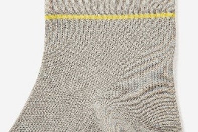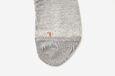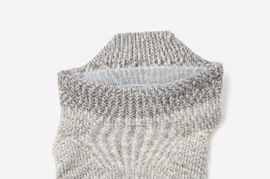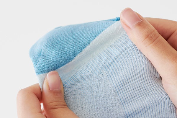 暑い季節はサンダルなどを履く機会が増えて、素足で過ごすことが多いですが、靴下を履いたほうが心地よく感じられるような、清涼感を得られるコットン素材のショートソックスを作りました。スポーティーすぎないデザインにもこだわりました。特殊な紡績で毛羽の出が少ない糸を使い、さらっとした春夏にぴったりの生地。さわるとひんやり感じる、接触冷感機能がついた靴下が完成しました。