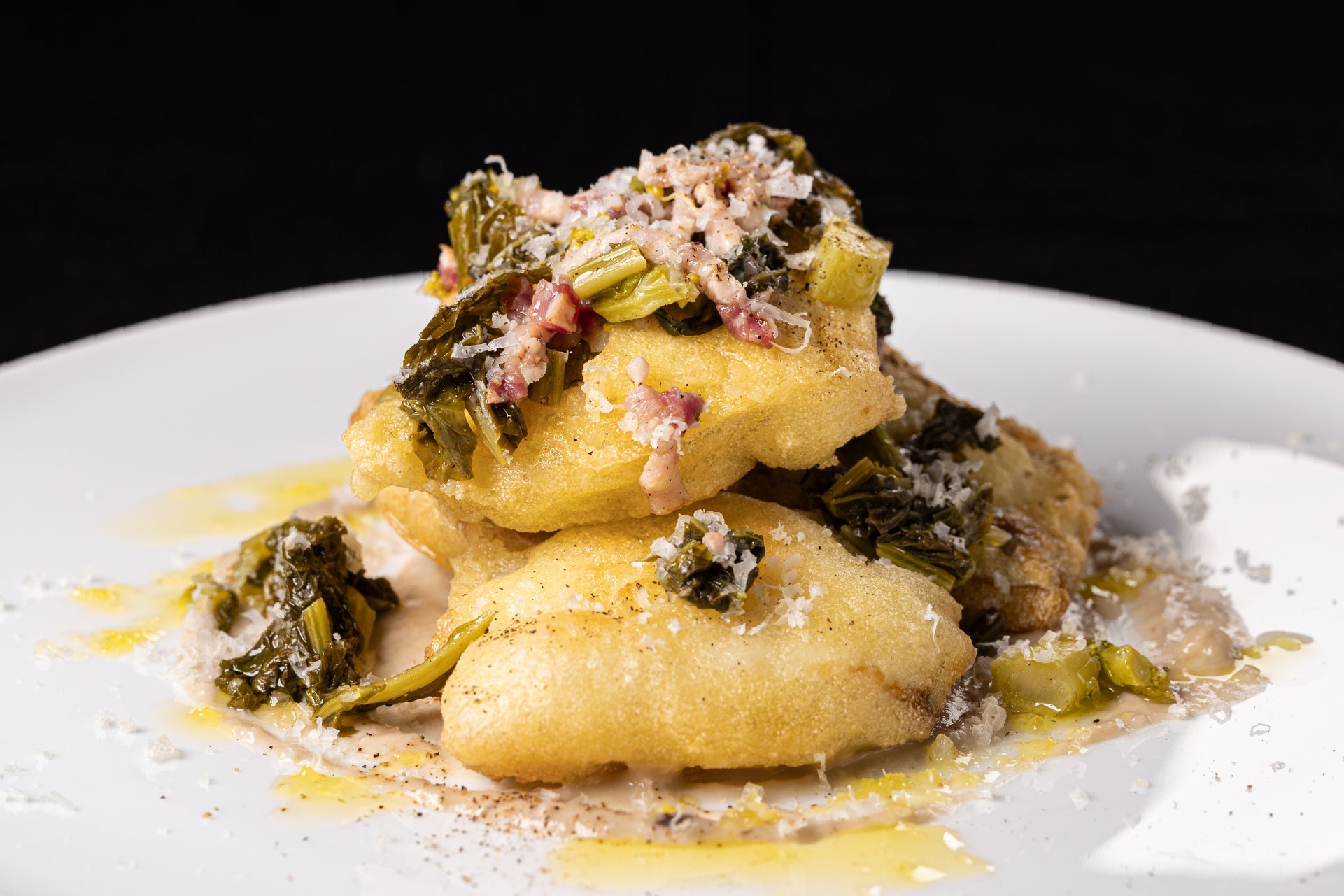 菜の花と生ハムをマリネした酸味を効かせたソースがふわふわ食感の太刀魚のやさしい旨みにアクセントを加える味わい豊かなひと皿です。